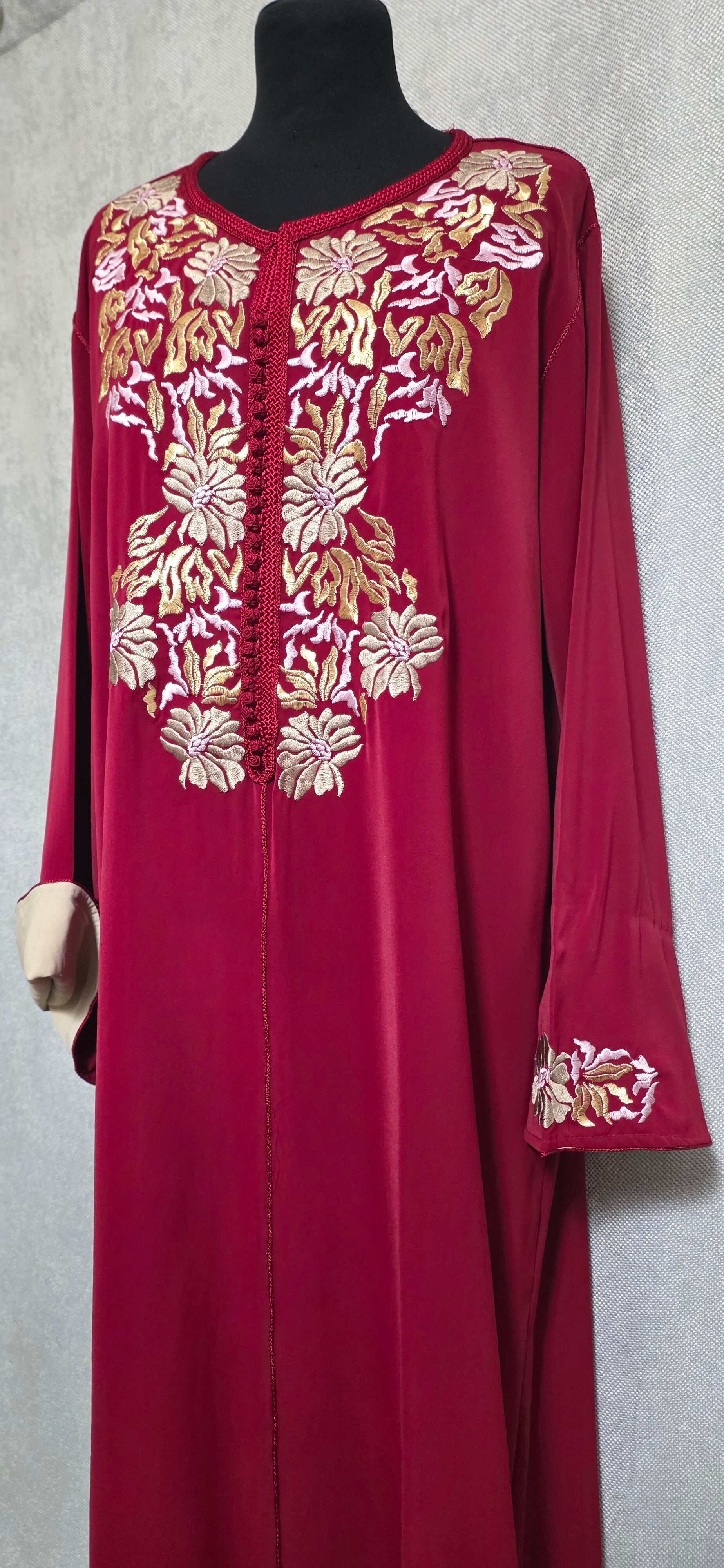 Tissu crêpe de soie avec une petite doublure au niveau les manches, elle est brodée soigneusement, elle peut se mettre de taille L jusqu'à taille XL, elle fait 60cm d'aisselle à aisselle