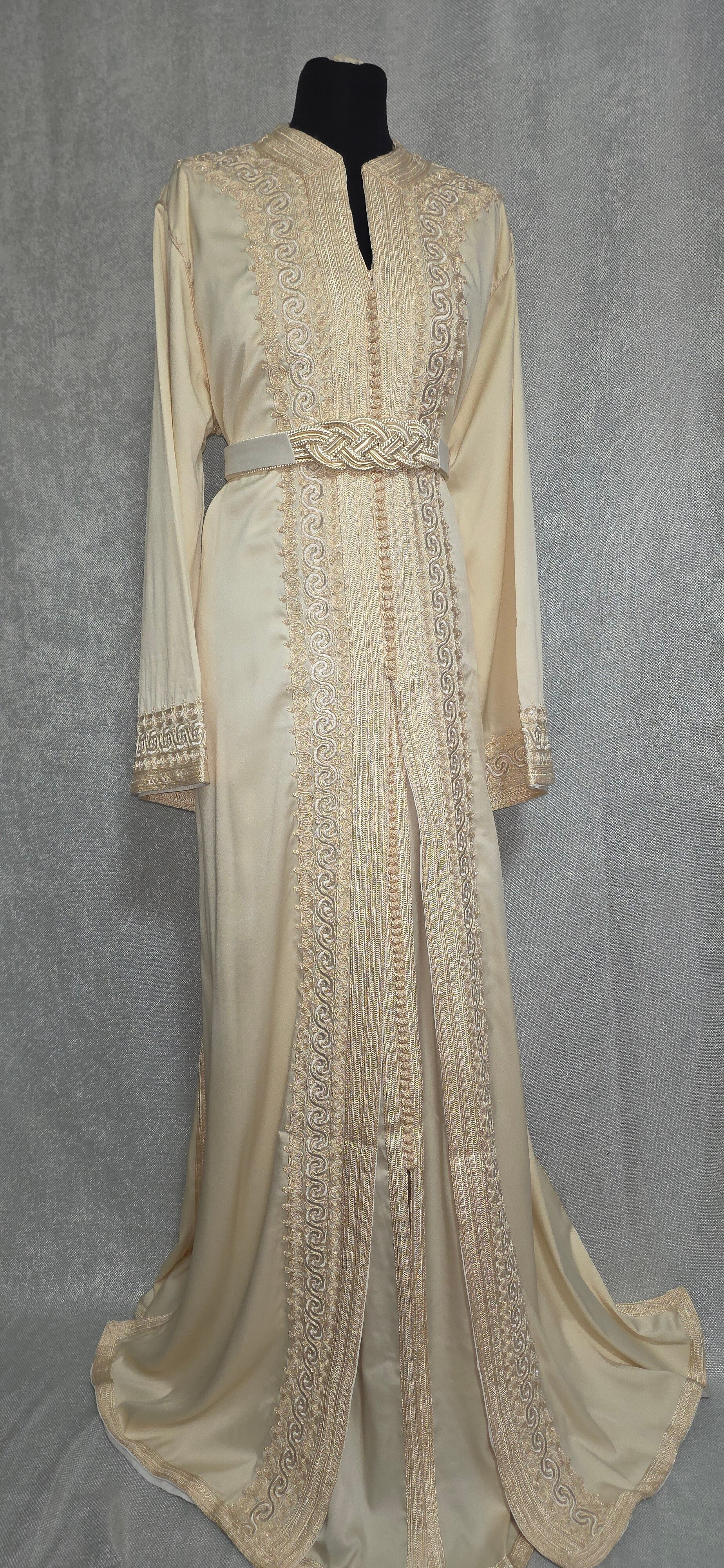 le tissu drap de soie, elle est tout brodée, elle est vendue avec la ceinture, elle fait 60cm aisselle à aisselle, elle peut se mettre de taille L à XL